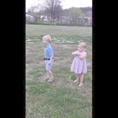 A tot girl runs to an easter egg in a backyard and tries to pick it up while a man pulls it on a string to keep it out of reach. The girl repeatedly says, "Come to me" as the man raises and lowers the egg, then another tot girl tries to help but can't grab the egg either.