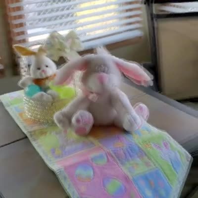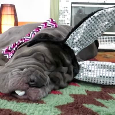 A goat wears bunny ears, paws, nose and googly-eyes. Music rights not cleared.