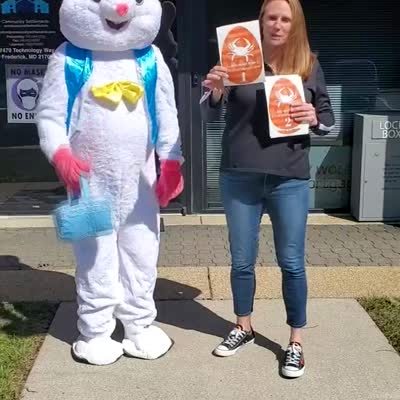A woman makes an announcement in front of a community building for an Easter event and the Easter Bunny's ear falls off the costume.