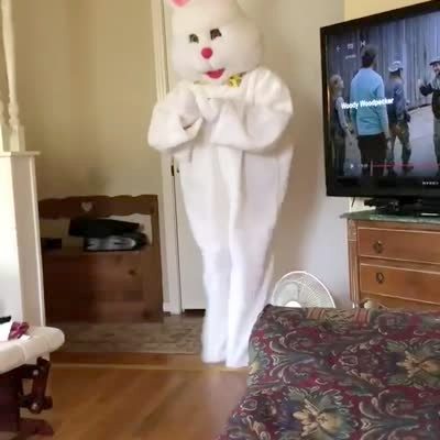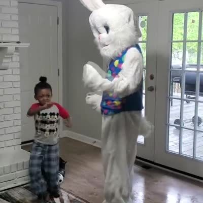 A young boy dances to "Renegade" with a man dressed as an Easter bunny in the living room.