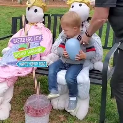 A tot boy sits on a stuffed Easter Bunny and screams and runs when the stuffed head falls onto him in a backyard.