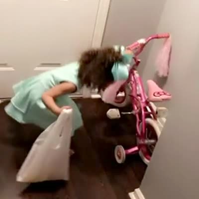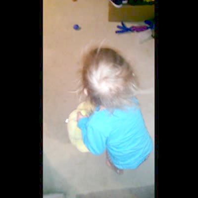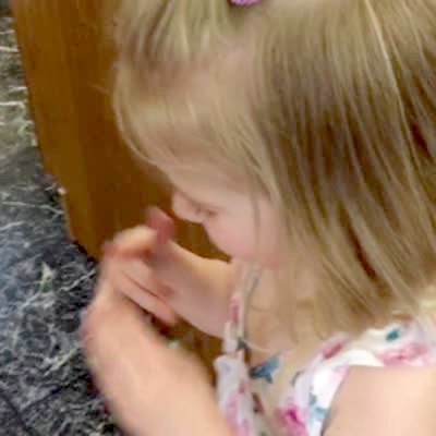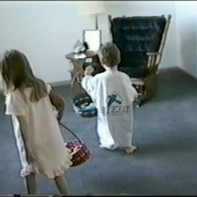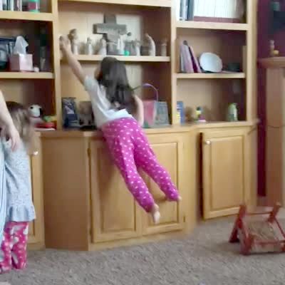 A young girl passes gas when she climbs a cabinet during an Easter egg hunt with a tot girl in the living room.