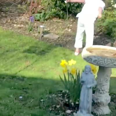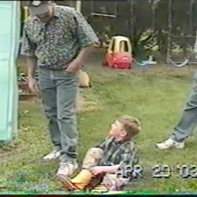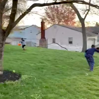 Boy knocks down his grandfather / senior man by hitting him with an easter egg