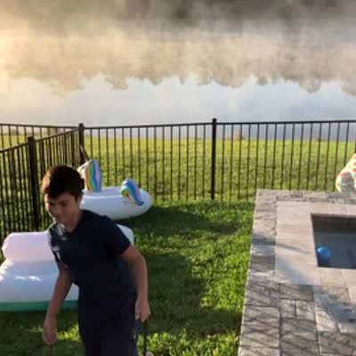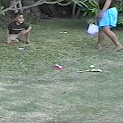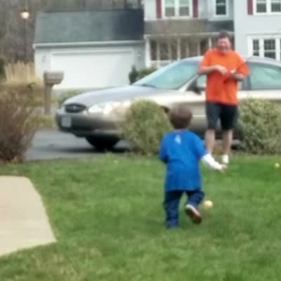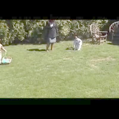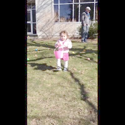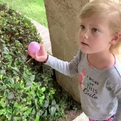 A man gives his daughter hot and cold clues to find an Easter egg in the yard. Eventually, it falls out of the tree branch above her and hits her in the head.