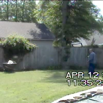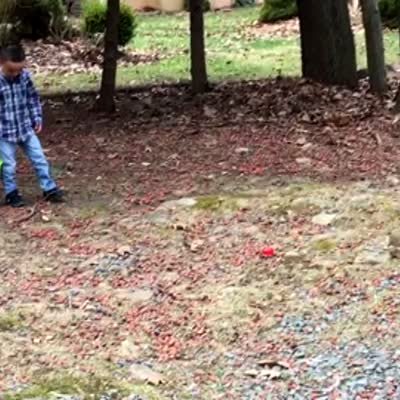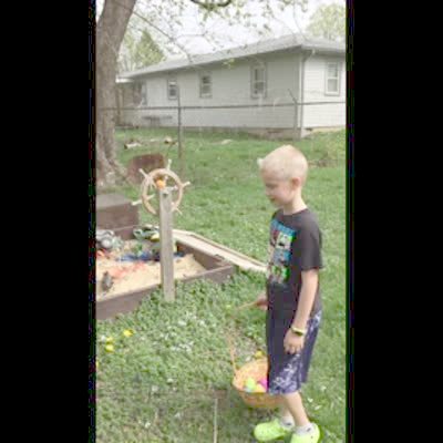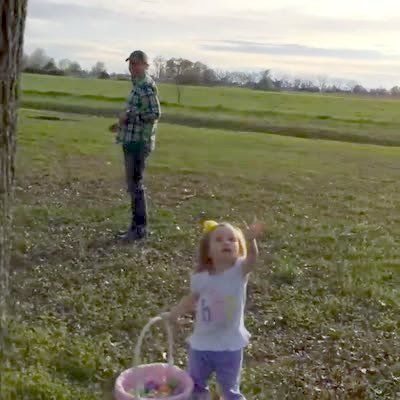 A young boy and young girl look for Easter eggs in a yard, then a man yells when he sees that a squirrel has picked up an egg and carried it into a tree. Easter