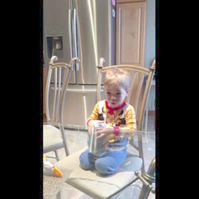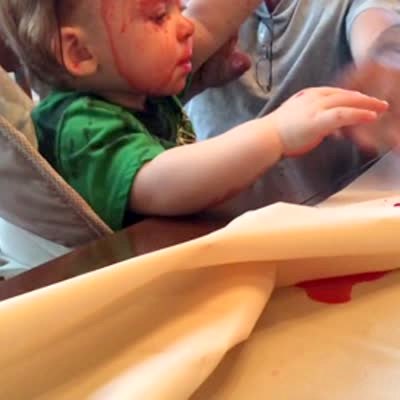 A tot boy plays with a container of red dye for Easter eggs and the lid pops off, splashing red dye all over his face.