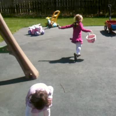 A young girl tells her dad that she has "really good eye sight" as she grabs a hidden plastic Easter egg off the swing set and her dad asks "oh, you do, huh?" as he looks down at an egg she missed that sits right on the seat of the swing.