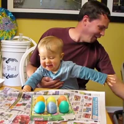 A baby boy picks up Easter eggs from a carton and throws them on the ground.