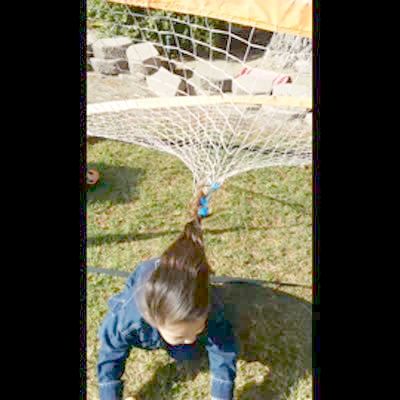 A young girl gets her hair stuck in a soccer net during an Easter egg hunt and she cries and kneels up and down when she's unable to pull her hair out to look for more eggs.