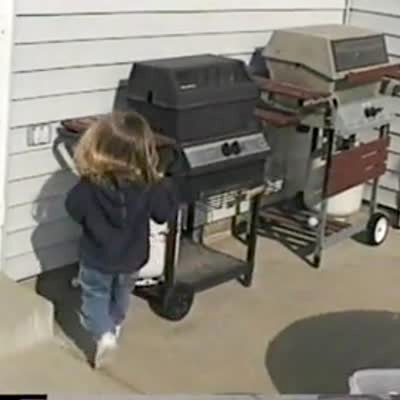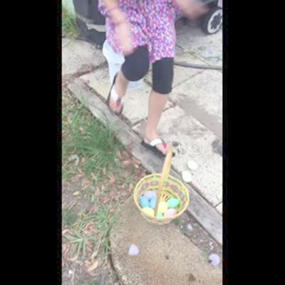 Little girl hunts for Easter eggs on the back porch and hits her head on a BBQ grill shelf. She falls down.