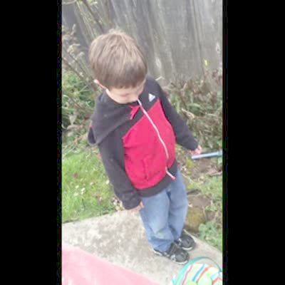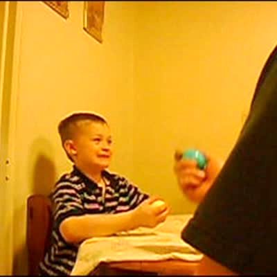 A young boy can't get a plastic Easter egg open. His brother slams the egg on his own head to open it.