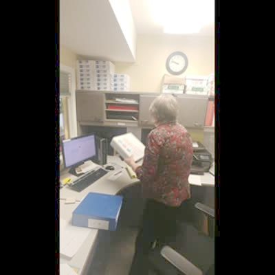 A senior woman opens a work desk cabinet and a bunch of plastic Easter eggs fall out.