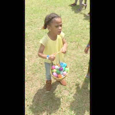 A teen girl and a young boy say how many Easter eggs they found, and the girl wins. She gives herself a high five and spills the eggs out of her basket.