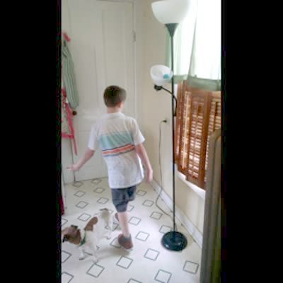 A young boy plays hot and cold with a man to find his last Easter Egg. It is in the lamp shade of a lamp next to him but he can't see it. He finally manages to find it.