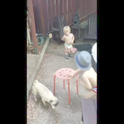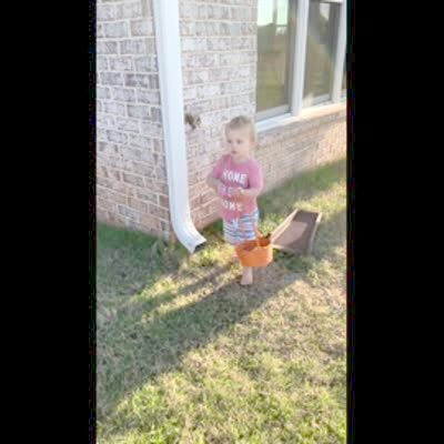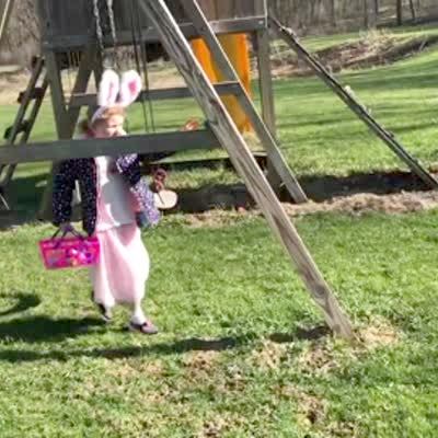A tot girl runs to an easter egg in a backyard and tries to pick it up while a man pulls it on a string to keep it out of reach. The girl repeatedly says, "Come to me" as the man raises and lowers the egg, then another tot girl tries to help but can't grab the egg either.