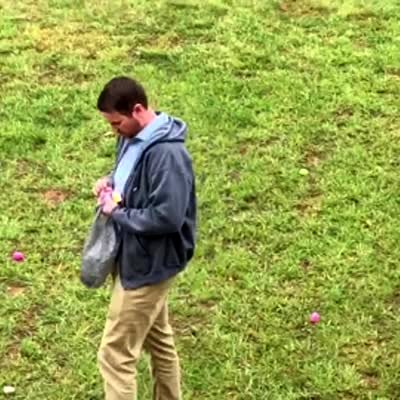 Boy on an Easter egg hunt hits a man in the crotch who jokingly steals his Easter basket. *tracking off .