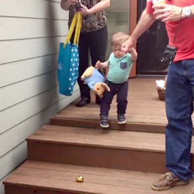 A tot boy hesitates as he walks down a flight of porch steps to collect an easter egg. Then, a senior woman falls through the porch and lands on her side.
