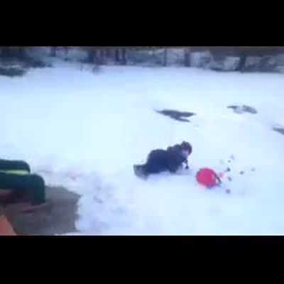 A tot boy goes down a slide with a bucket/ basket of Easter egg candy in the snow. He crashes on the ground and his candy slides into a puddle.
