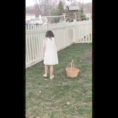 Tot girl in Easter dress looks / hunts for eggs in the yard, picks up dog poop by mistake