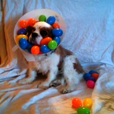 A King Charles Cavalier dog wears a cone from the vet stuffed with Easter eggs indoors.