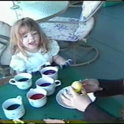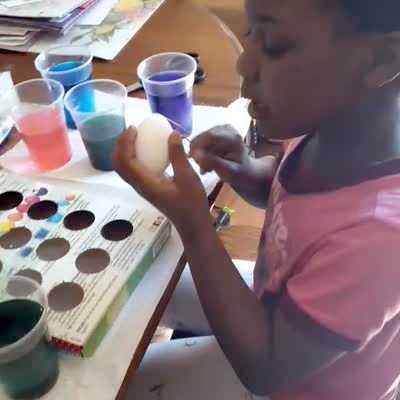 A young girl talks to the camera while she dyes Easter eggs at a dinner table, she accidentally drops her egg, it knocks a cup of dye over and spills in her lap, then she screams.
