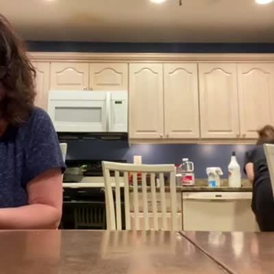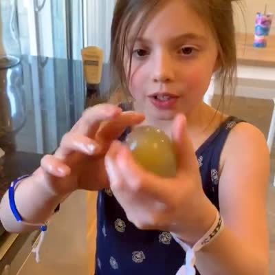 A young girl shows her mother a bouncy egg she made in the kitchen, and the egg explodes in her hand.