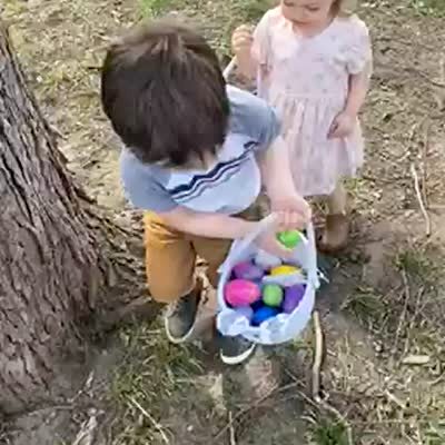 2 young kids a boy and a girl hunting for Easter eggs. Boy finds one and gets excited, falls over, trips.
