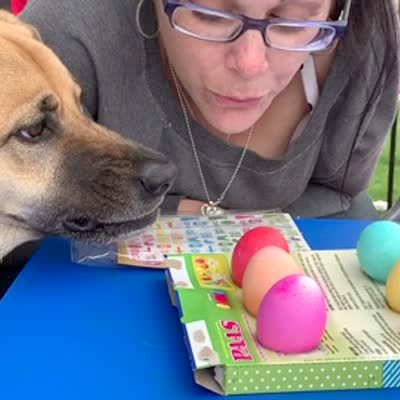A woman blows on Easter eggs and her dog shows its teeth.