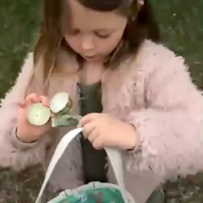 A young girl opens an easter egg and finds a bug inside. She screams and drops the egg.
