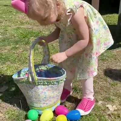A tot girl drops an easter egg into her basket, but she misses the basket repeatedly until she carefully places the egg into the basket.