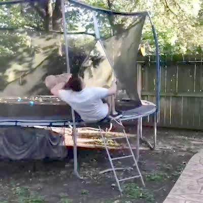 A teen girl and a man run into the backyard to look for Easter eggs. The man falls when he tries to climb up into the trampoline.
