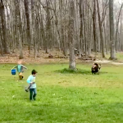 While two young boys search for Easter eggs, a turkey chases the boys around a yard.