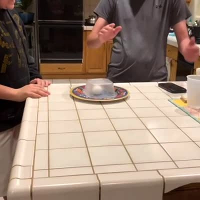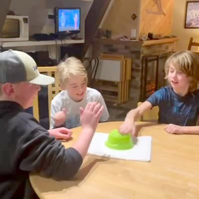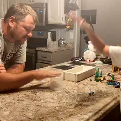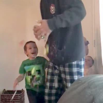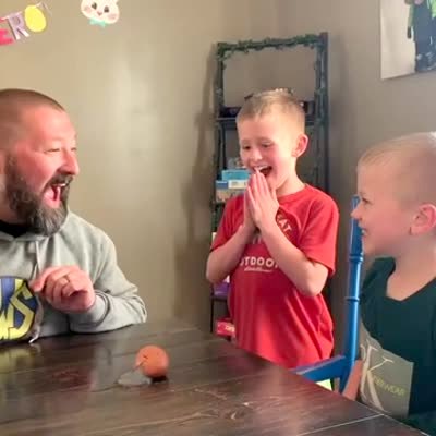 A man does the egg smash challenge with his two young sons, then one son breaks the egg in a dining room.