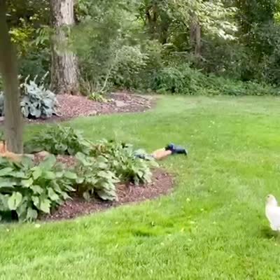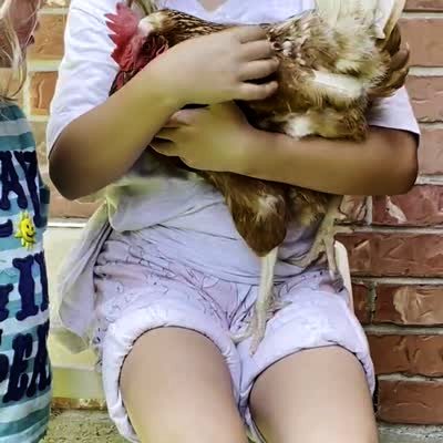 In a yard, as a young girl holds a hen chicken and describes her and how she lays eggs, the bird actually lays an egg in her lap.