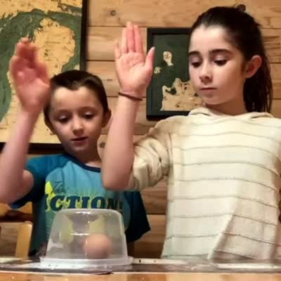 A young boy and a young girl do the egg smash challenge in the dining room. The girl smashes the egg and makes a scared face and reaches for the camera and the boy laughs.