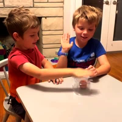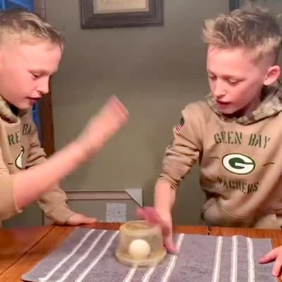 Two twin boys compete in the egg smash challenge, then one boy smashes the egg and they both yell in a kitchen.