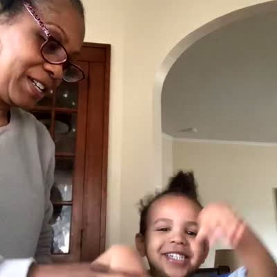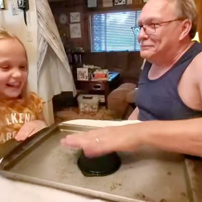 A young girl and a senior man do the egg smash challenge in a kitchen. The young girl breaks the egg with her hand and laughs. Egg Smash Challenge