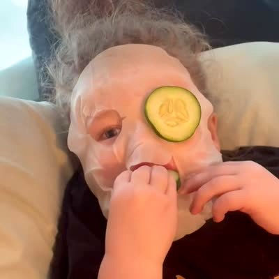 A young girl has cucumber slices on her eyes as she wears a face mask. She takes a bites from the cucumber then places the cucumber slice back on her eye.