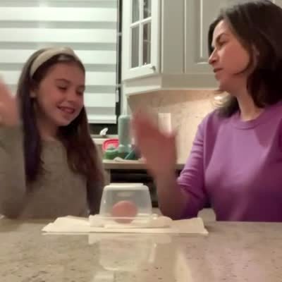 A woman and young girl play the egg smash challenge then the girl smashes the egg and yells in the living room.