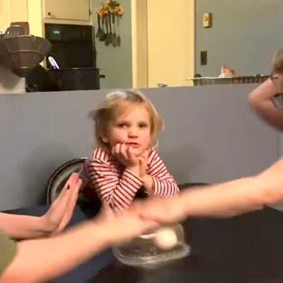 A young girl and a young boy play the egg smash challenge on the dining room table. A tot boy watches. The girl smashes the egg.