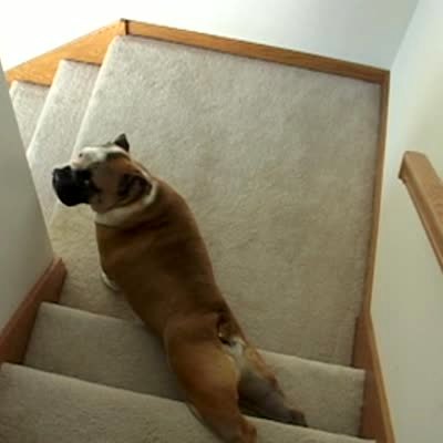 "No Jog Bulldog" An English bulldog dog sits on a treadmill indoors when his owner warns him to walk or he's going to fall off. He sits again and stares at his owner but stands to walk each time he gets too close to the back and his owner reminds him to walk.