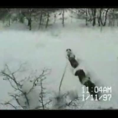 An English Bulldog jumps onto a trampoline. The dog crashes into the netting.