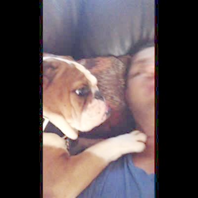 An English Bulldog dog loves to be kissed by her owner and paws at his face when he stops kissing her indoors.
