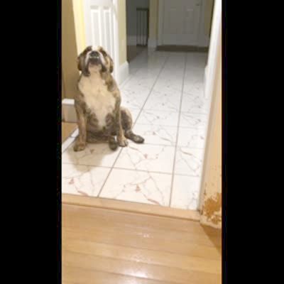 A woman finds flour all over a kitchen floor and an English Bulldog stands in the kitchen with flour all over his face.