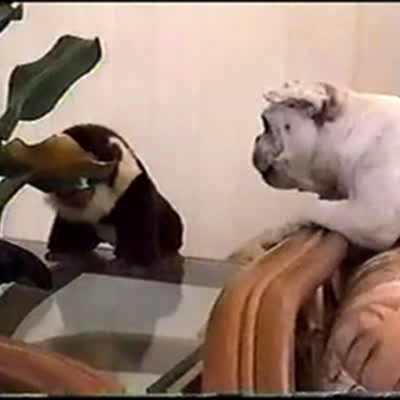 An English Bulldog puppy dog sees his reflection in a mirror and charges at it repeatedly until the mirror falls over and the dog runs away.