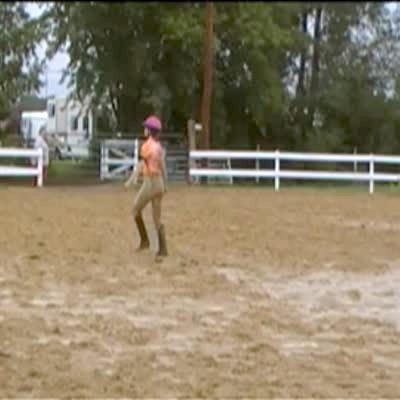 Two women ride horses into a pond. One of the horses runs to get out of the water and bucks the woman off its back. Featured talent cleared (the two women riding the horses).