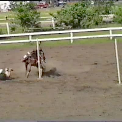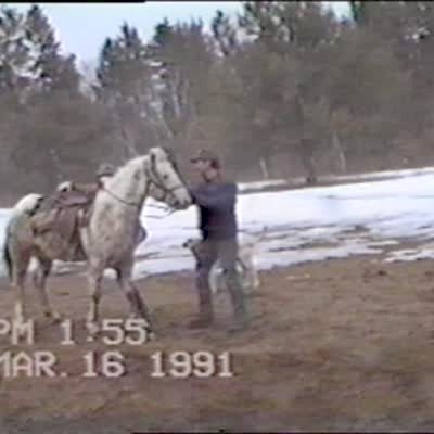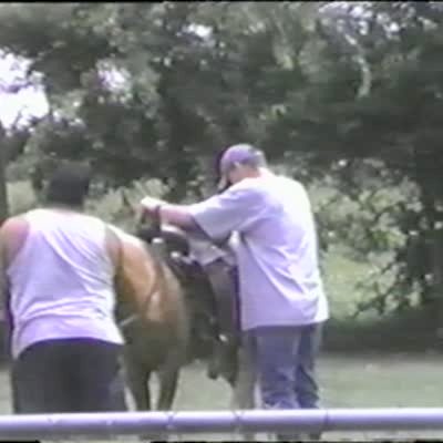 Woman tries to mount horse by climbing its neck. Horse picks up woman and flips her on his back, she falls off. *tracking off