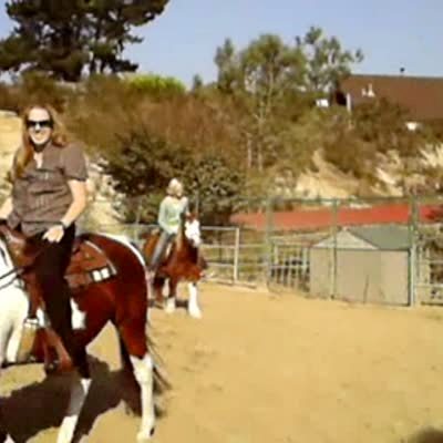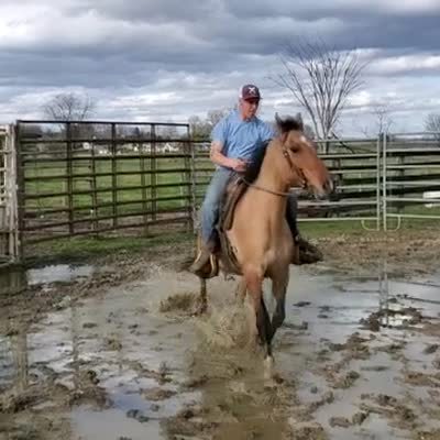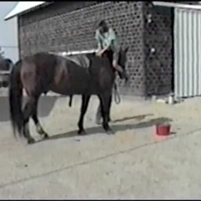 Teen girl lets her horse get a drink out of a trough. Horse decides to jump into the trough. Teen girl jumps off horse
