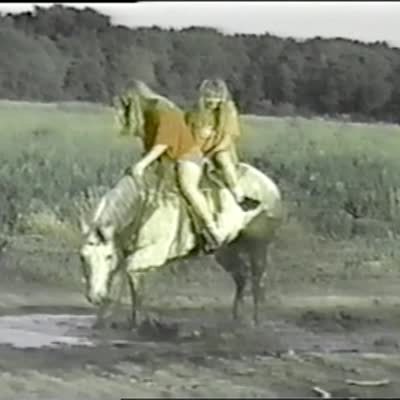2 teen girls riding horse over mud puddle, horse kneels down & knocks them both into the mud. Mess, dirty.