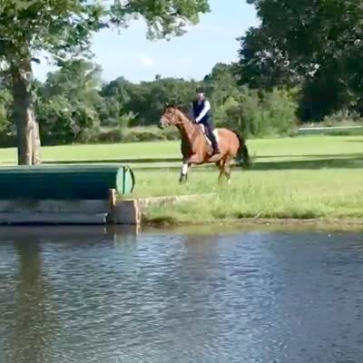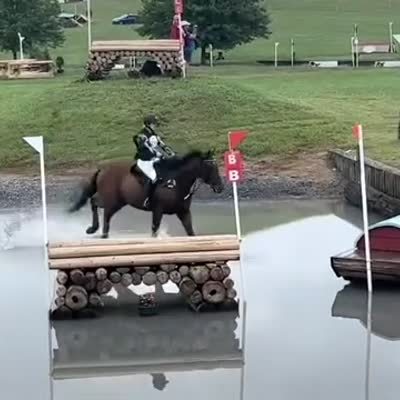 A young woman rides a horse through a shallow pond and jumps a hurdle. She tumbles forward, off the horse and into the water. TikTok video.